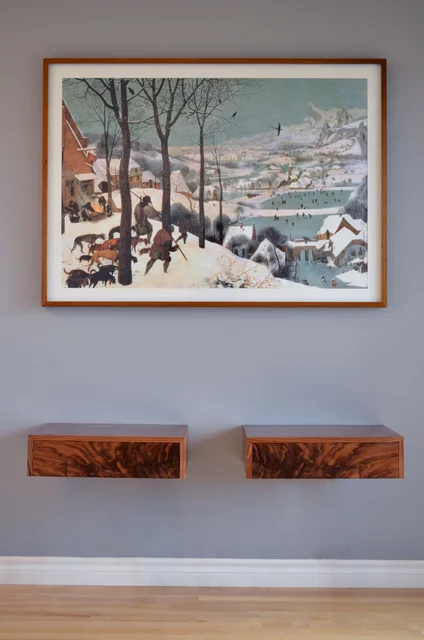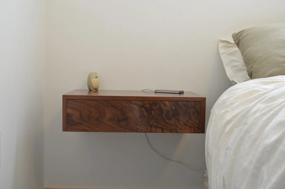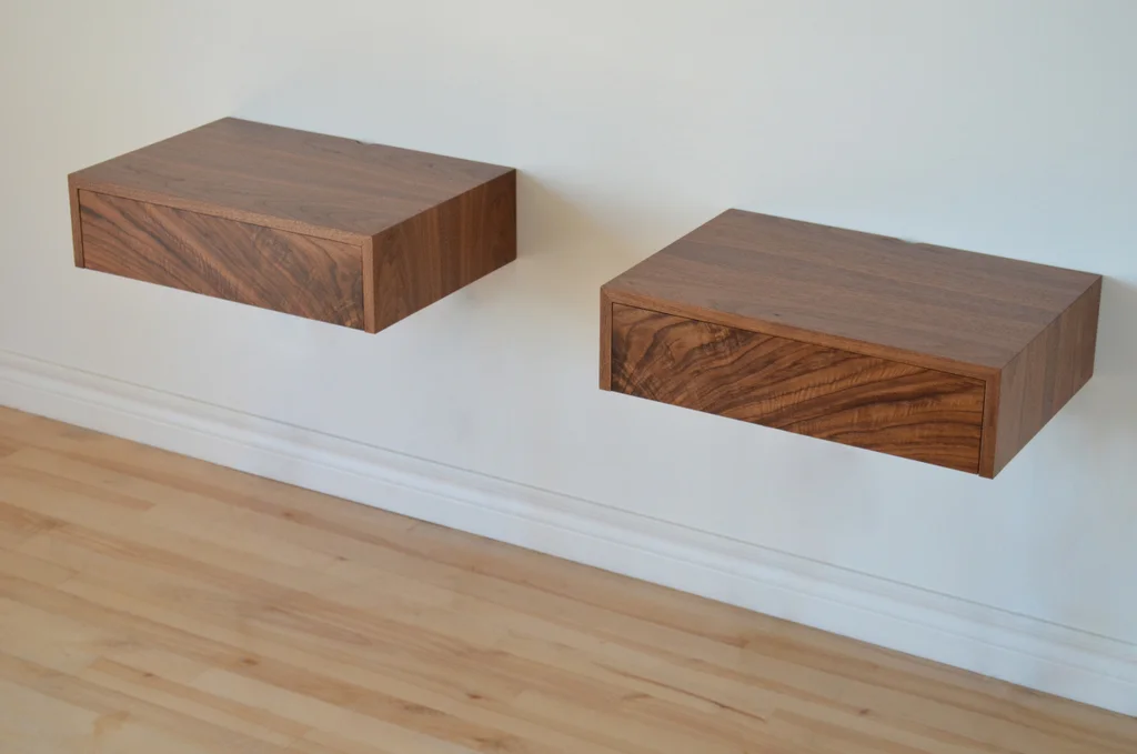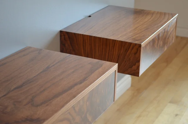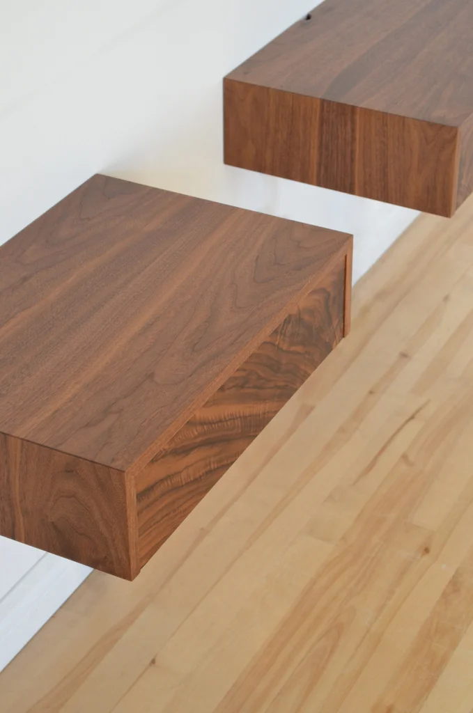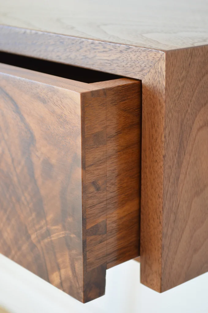 I hand select only the nicest solid 8/4 black walnut which I resaw to get amazing bookmatched sets to create the main bodies and drawer fronts. I use traditional hand cut dovetails for the drawer joinery which creates an exceptionally strong drawer. Not only are the pieces entirely bookmatched but I also use a seamless waterfall mitre for the exterior joinery, so the grain of the boards wrap around the sides and top. There is an integrated hidden drawer pull, so the unique grain of the drawer front is front and center .